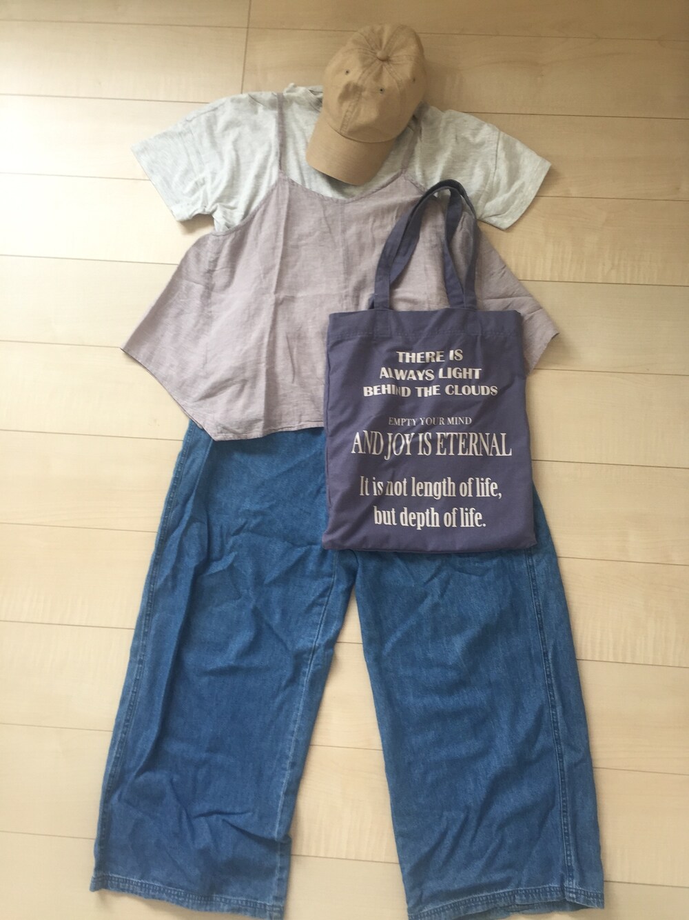 白Tシャツ×グレーのキャミ×デニムワイドパンツ 小物はベージュのキャップとネイビーのトート
