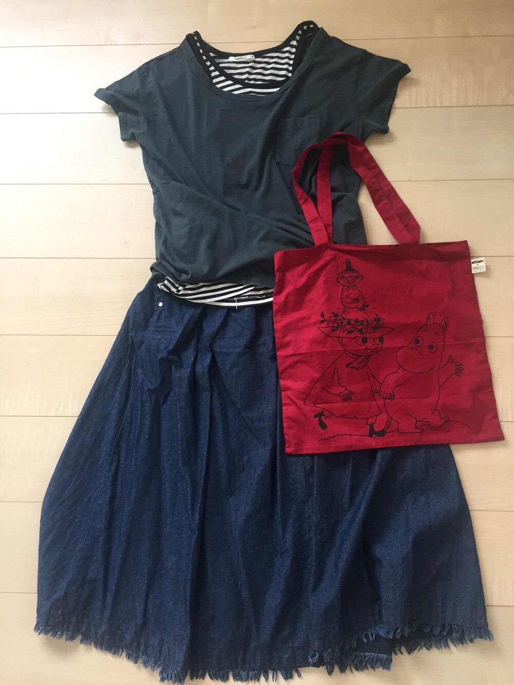 グレーのユーズドTシャツ×ボーダーのタンクトップ×デニムのスカート 小物は赤のトート GUで見つけたユーズドのゆるT✨ 私の好みです⤴︎⤴︎ ラフにゆるく着るのが好きです😊