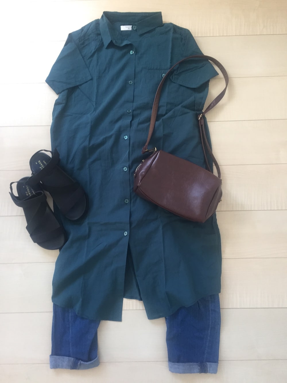 グリーンのシャツワンピース×ボーイズデニム×黒のスポーツサンダル😊✨