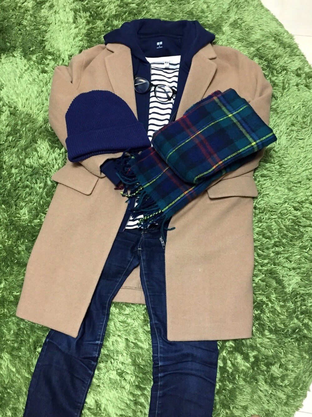 チェスターコート×パーカー×ボーダー×スニキー 小物はニット帽とストール チェスターコート脱ぐとネイビーのワントーンコーデ!!