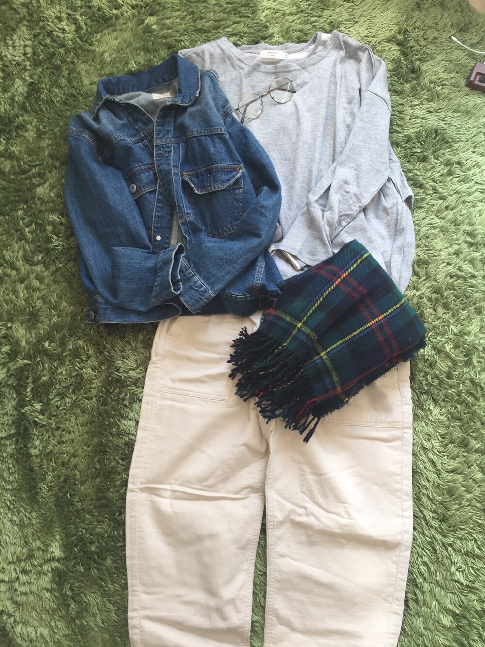 グレーのトップス×グレーボーダーカットソー×白のパンツ アウターはGジャン!! 小物は丸メガネとチェックのストール! 靴は真っ白のスニーカー!