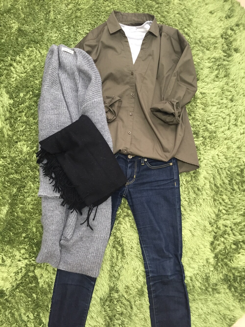 カーキのビックシャツ×ネイビーのスキニーパンツ×ボーダーカットソー グレーのロングカーディガン 小物は黒のストール 靴は真っ白のスニーカー