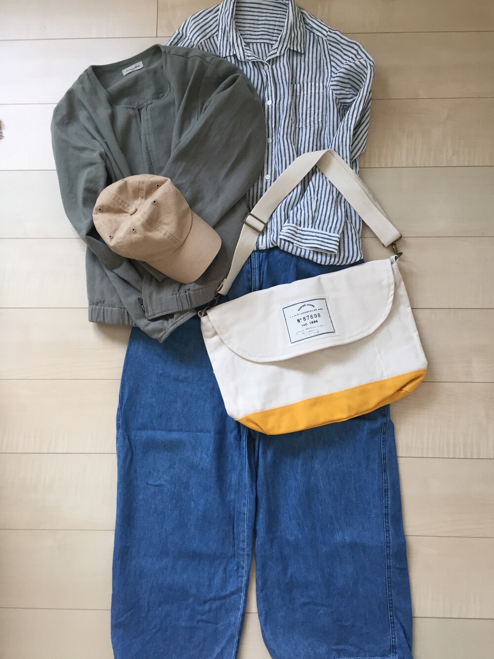 ストライプシャツ×ワイドデニム×カーキノーカラージャケット 小物はベージュのキャップ、キャンパスバッグ 靴は白のスニーカー ブルー系のストライプシャツとワイドデニムでシンプルに爽やかにしてみました♪