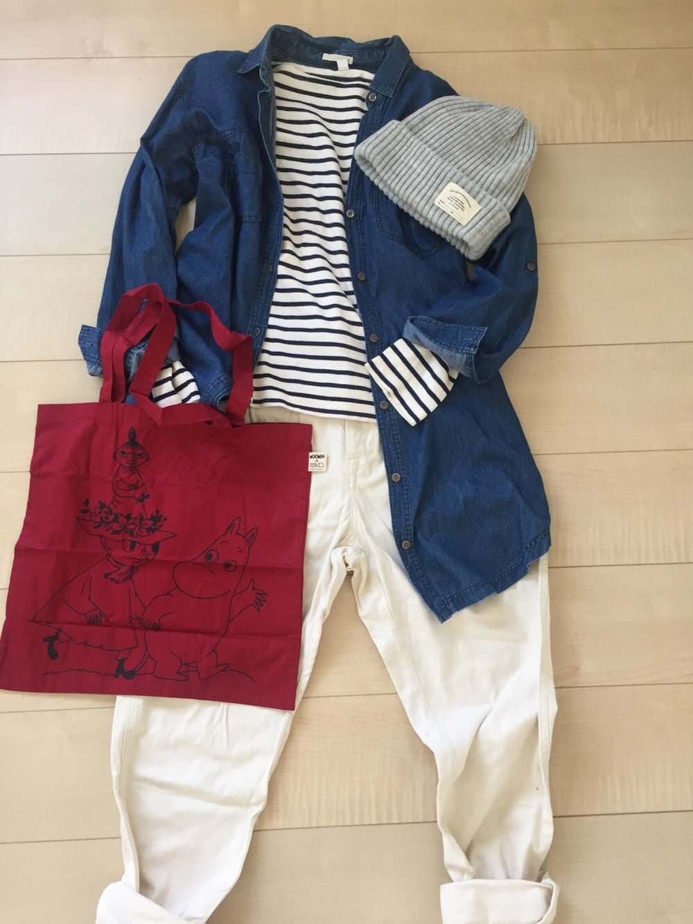 デニムワンピース×ボーダーカットソー×ホワイトパンツ 小物はムーミンの赤バッグとグレーのニット帽 靴は白のスニーカー 赤のムーミンバッグをメインにしたかったので他はシンプルにしてみました(*・∀・)✨ デニムコーデ続いてます😊
