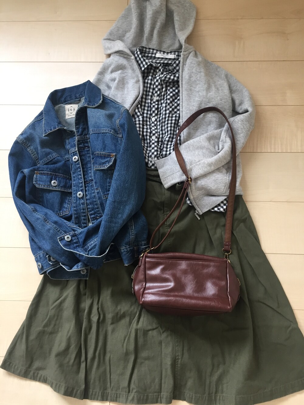 白黒のギンガムチェックのシャツ×グレーのパーカー×カーキのスカート アウターはGジャン 久しぶりのスカートコーデ💕
