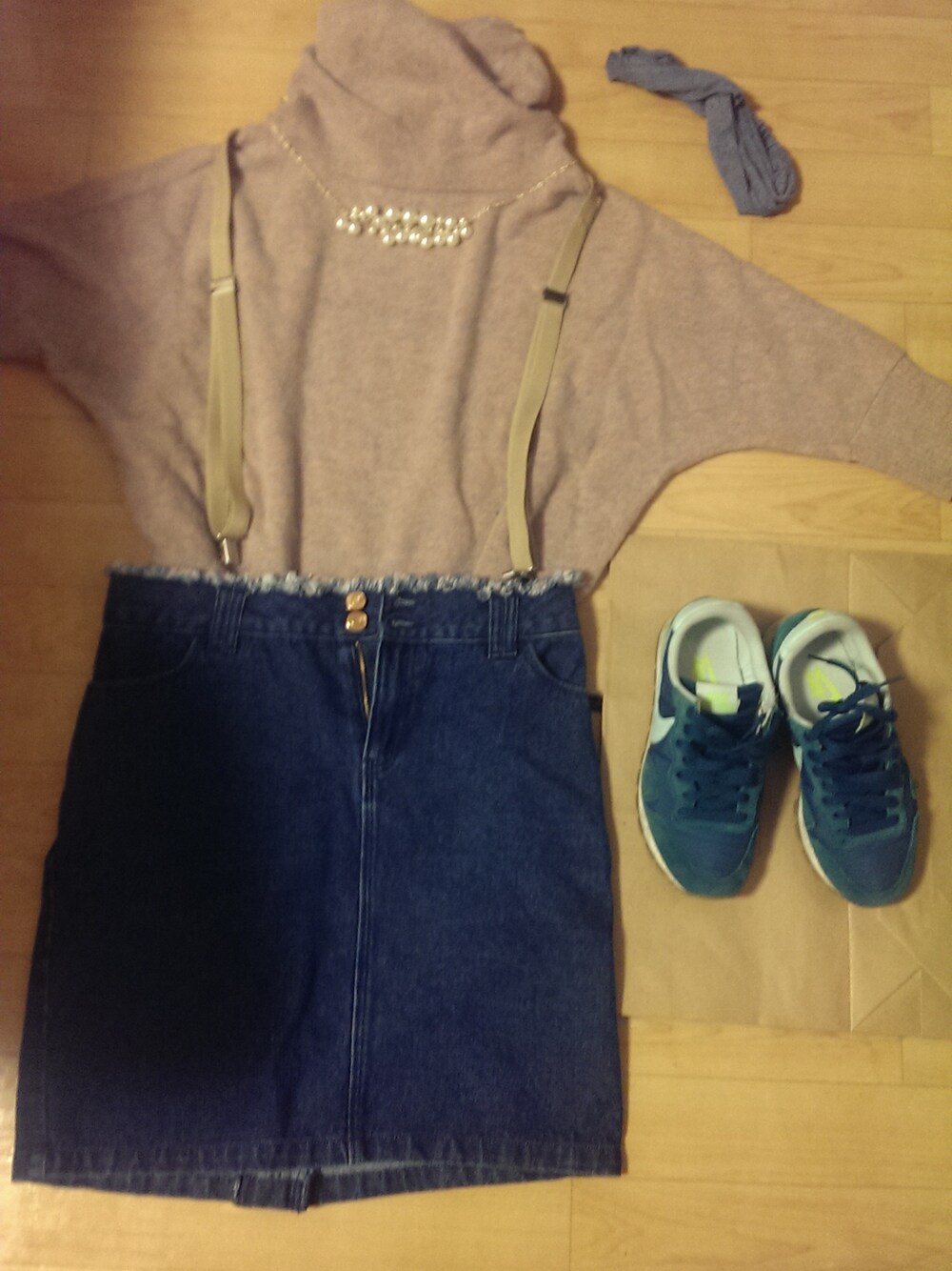 グリーン系のスニーカー、ブルー系のデニムスカートを着用したレディースの春コーディネートの1枚目の写真