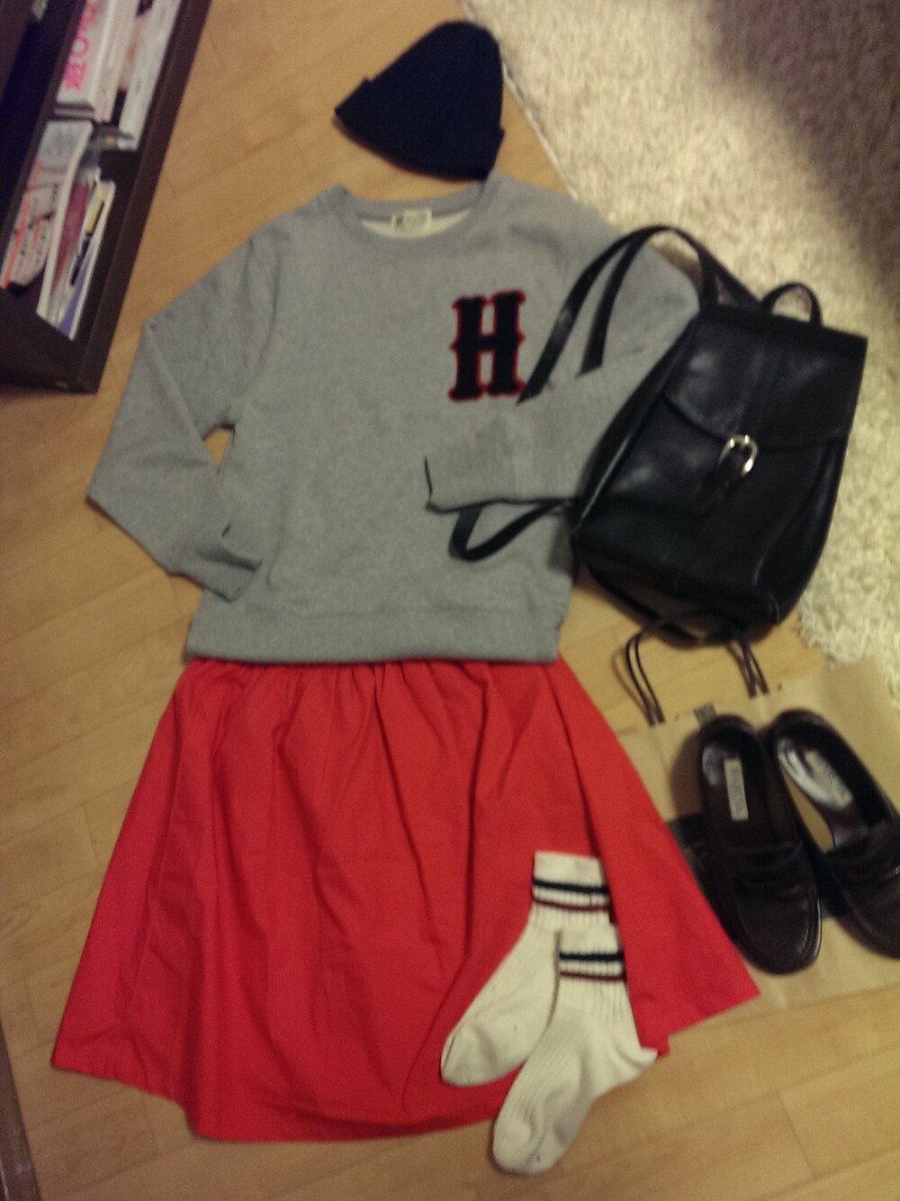 真っ赤なスカートがポイントです(^-^)/ スウェット chiaopanic スカート ROGER'S リュック flower ソックス 靴下屋 ニット帽 ROGER'S