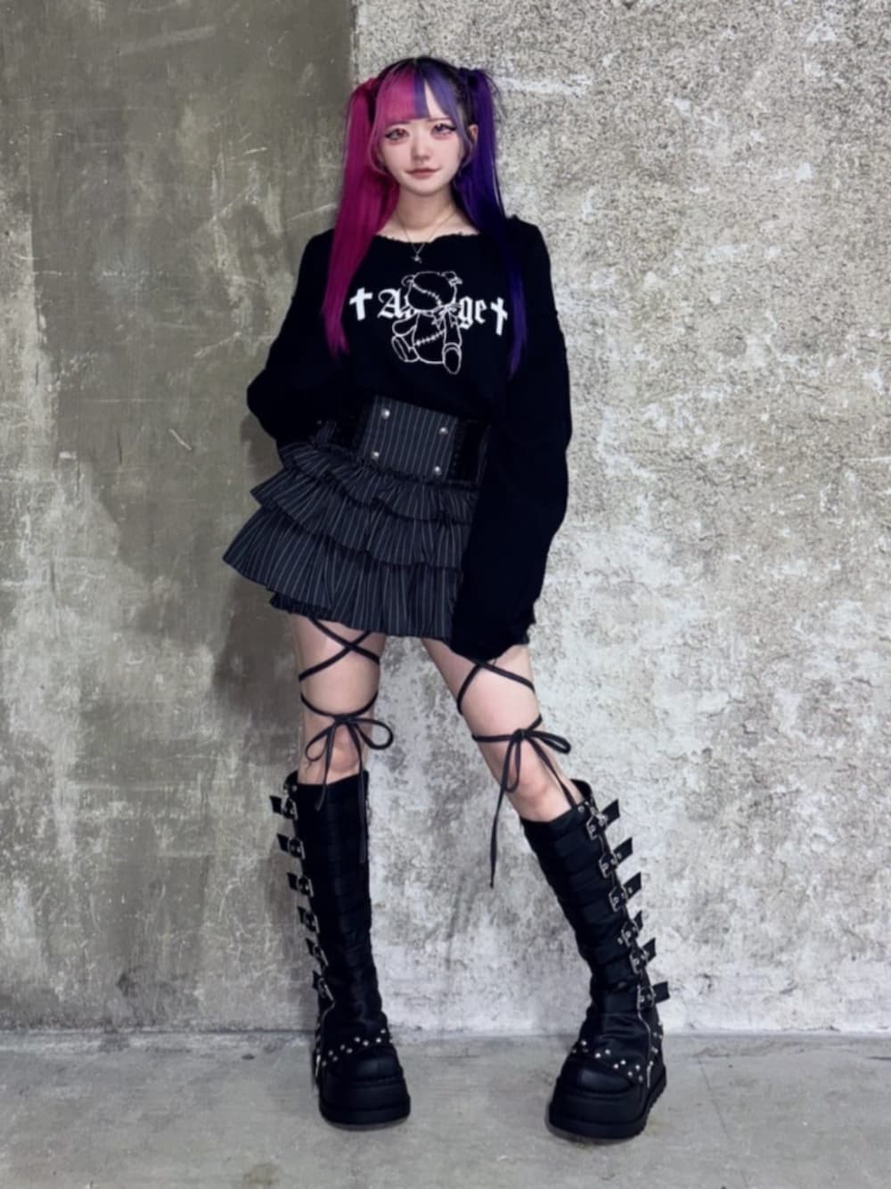 大人気フリルパンツが再入荷!!!! 真っ黒なトップスにはストライプがおすすめ♥ このクマちゃんのトップスはスカートインしてもプリントが隠れずに残るから合わせやすい代表トップス( '-^ )b 安定に盛れるから骨ストさんにもオススメ!!