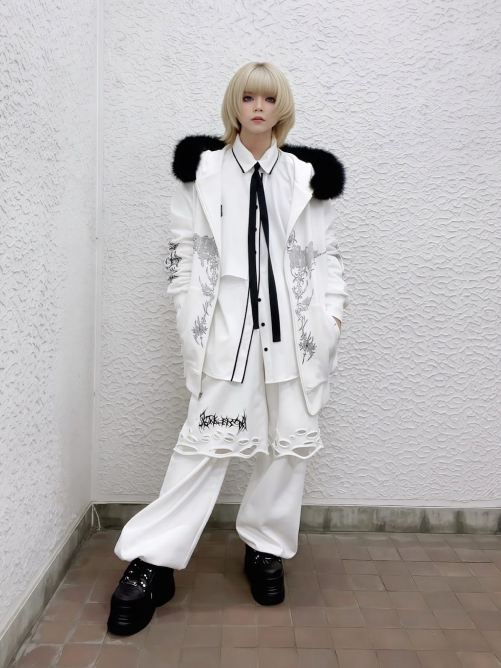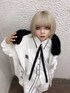 オールホワイトコーデ♪♪ ジェンダーレスコーデが好きな方にオススメ!パーカーはふわふわのファーに大きくラインストーンで描かれたサブカルAmiligeロゴ、腕にはシャンデリアのプリントがポイント♡♡ シャツとラフなパンツを合わせるとキレイめだけどゆったり着れる、ホワイトコーデの完成✧*。