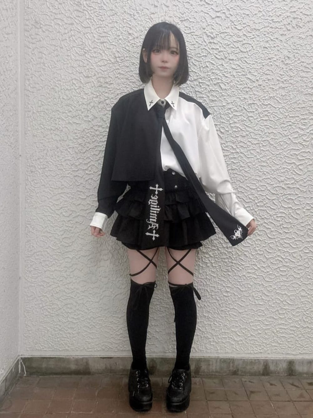 バイカラーシャツとフリルパンツとのコーデ🖤 ̖́-シャツのリボンをネクタイに結んでつけてます!襟の十字架やリボンの刺繍がかわいいシャツです✨️暖かくなってきたこの季節にピッタリです!