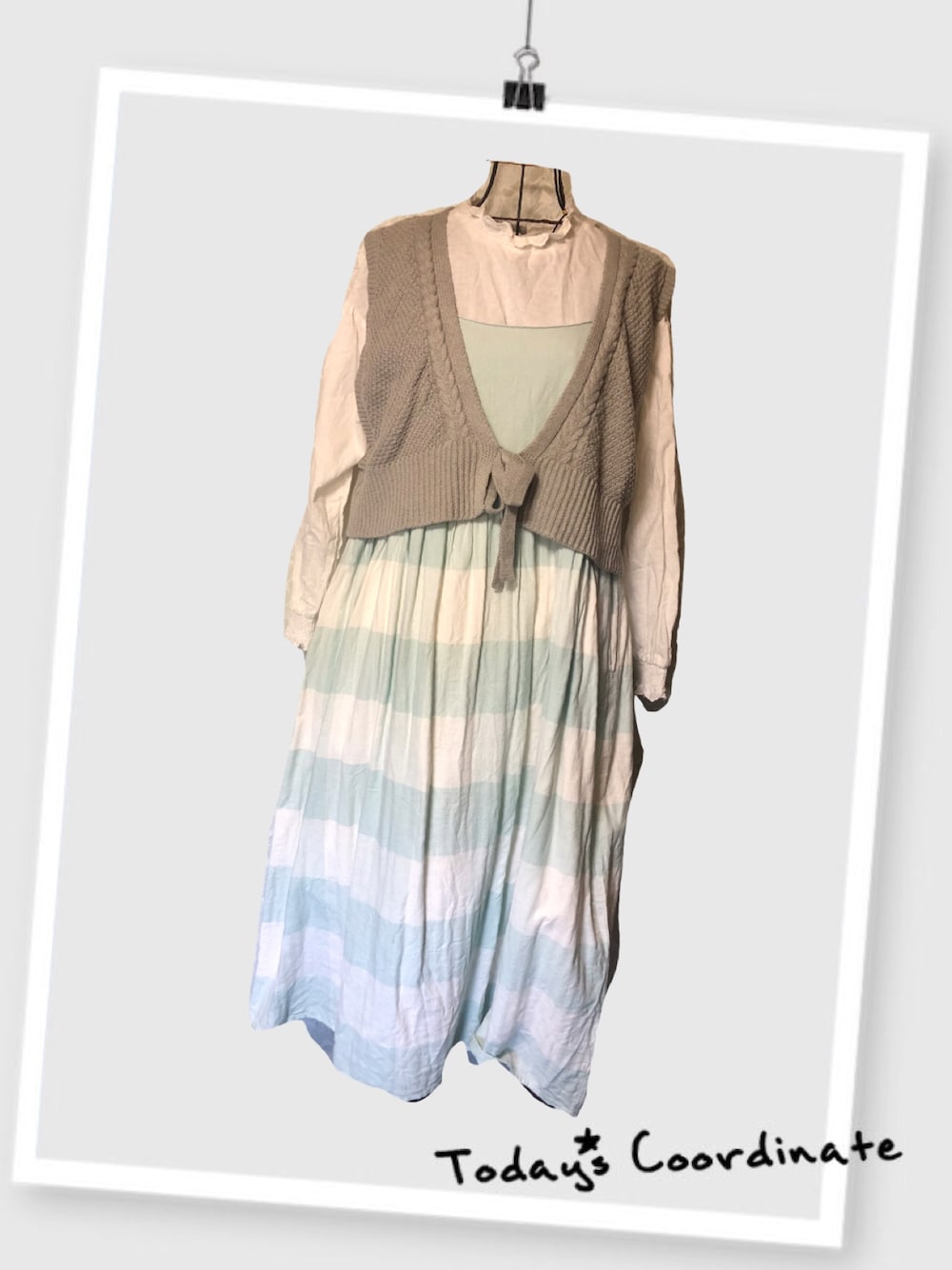 おはようございます いつもありがとうございます 今日はモスモスです😙 ミントチェックと、グレーのベストあわせてみたー! 今日のテーマセットアップなのに つい最近セットアップふたつも手に入れたのに、逆らっていく😂 昨日天気曇りだったのに 今日の天気が良すぎてさーー。 お布団干すかぁ!!