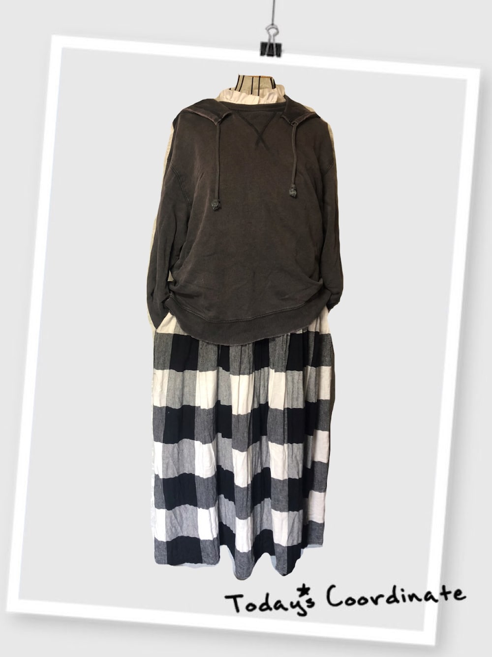 おはようございます いつもありがとうございます 台風数回、だいぶ空気が秋になって長袖がちょうど良くなってきました。 衣替えももうそろそろしないとなー あと早めにタイツ買い漁る!! 時期になると全くなくなる😂 今日はGUの炭黒パーカーとモスモスのブロックチェックジャンスカ! スリコじゃないけど300円のとこで買ったつけ襟!