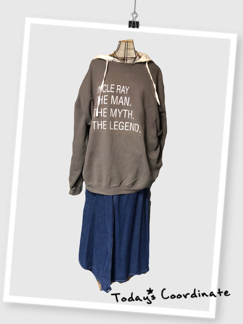 こんにちは いつもありがとうございます ゆったりスエットにデニムスカート 中にフードのついた羽織ブラウス仕込みました!このスエット、フードとか襟出した方がバランスが良い気がして。。 休みってあっとゆーまですねぇ。 もうお昼😫💦