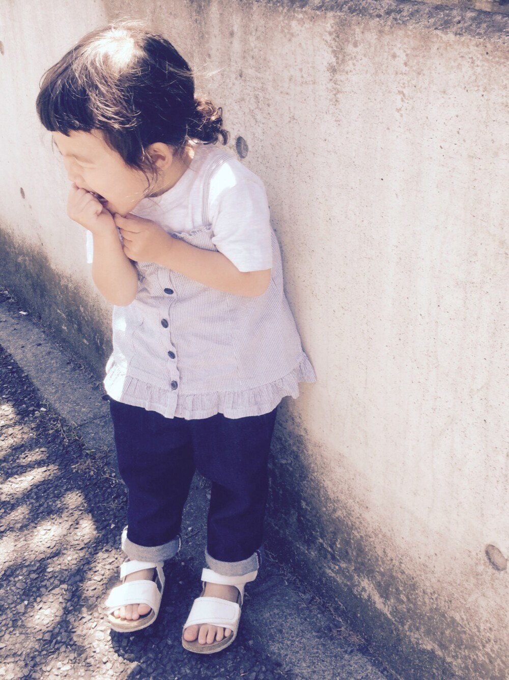 カメラを向けると何故か毎回このポーズ ビスチェ着てるのが見えないよ… 娘は見事なカモメ眉です…