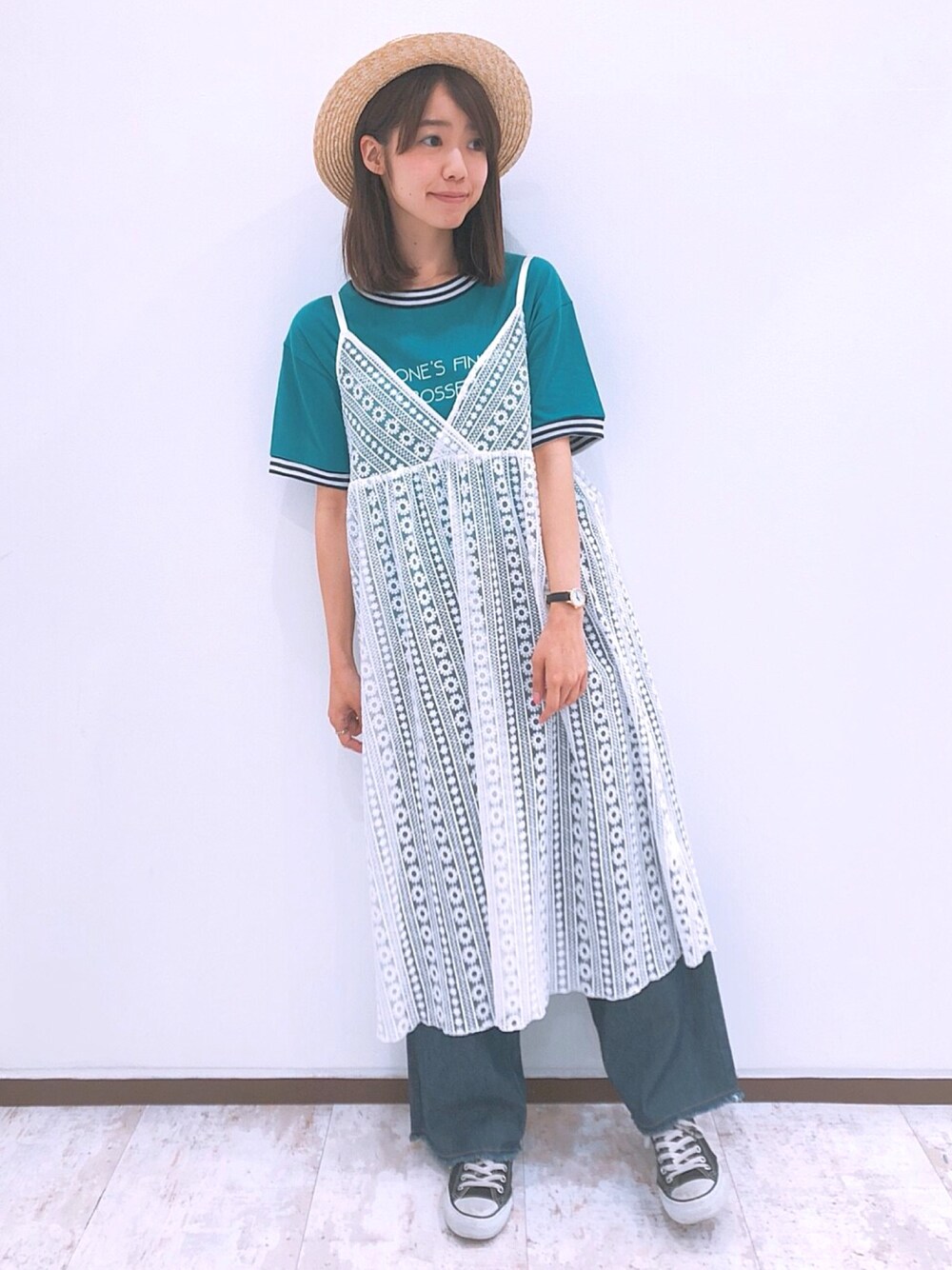 いつものTシャツ×ワイドデニム×スニーカーコーデも、 レースワンピを一枚プラスするだけでオシャレ度がぐーーーんとアップします🙆♀️💕 アジャスターで丈を調整できるので、小さめな方にもオススメですよ🙃✨