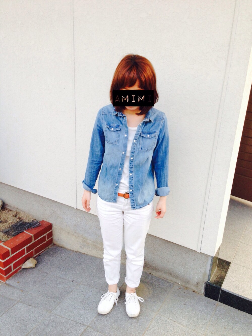 おひさしぶりです!!! 夏だから真っ白!!! デニムシャツ h&m 真っ白シャツ ローリーズ パンツ ユニクロ スニーカー 無印