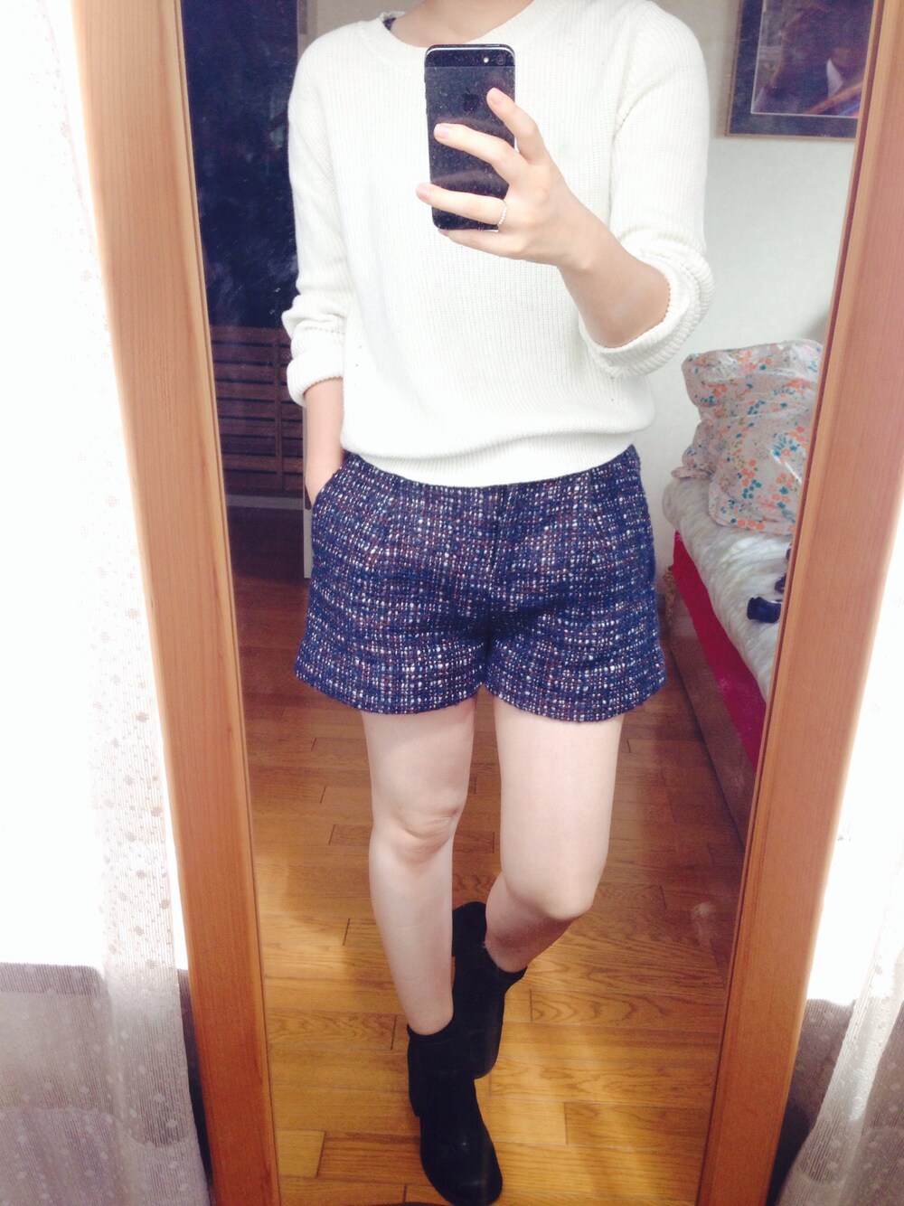 昨夜買ったばかりのGAPのツイードのショートパンツ! 全品半額セールだったので、3500円という破格値でした! しっかりした生地でオススメです〜。 タイツにも合わせたい。