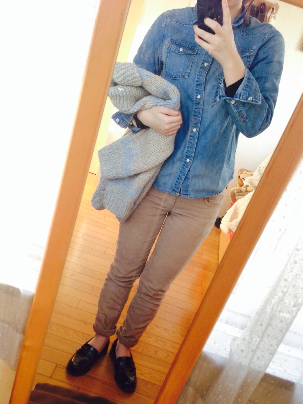 ざっくりニットのカウチンを引っ掛けて デニムシャツ h&mキッズ コーデュロイパンツ ユニクロ エナメルローファー GW カウチン ピュアルセシン