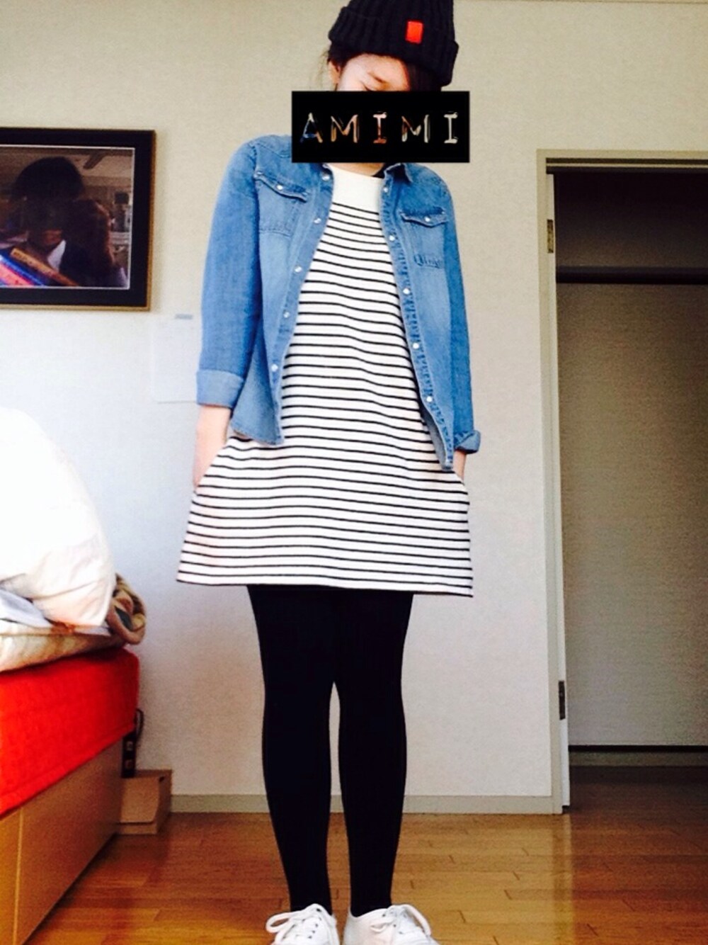 てけとー! ニット帽とスニーカー GU 990円 デニムシャツ h&m 1990円 ボーダーワンピ 無印キッズ 1500円 いいお天気ですね、皆様休日を満喫してくださいね!