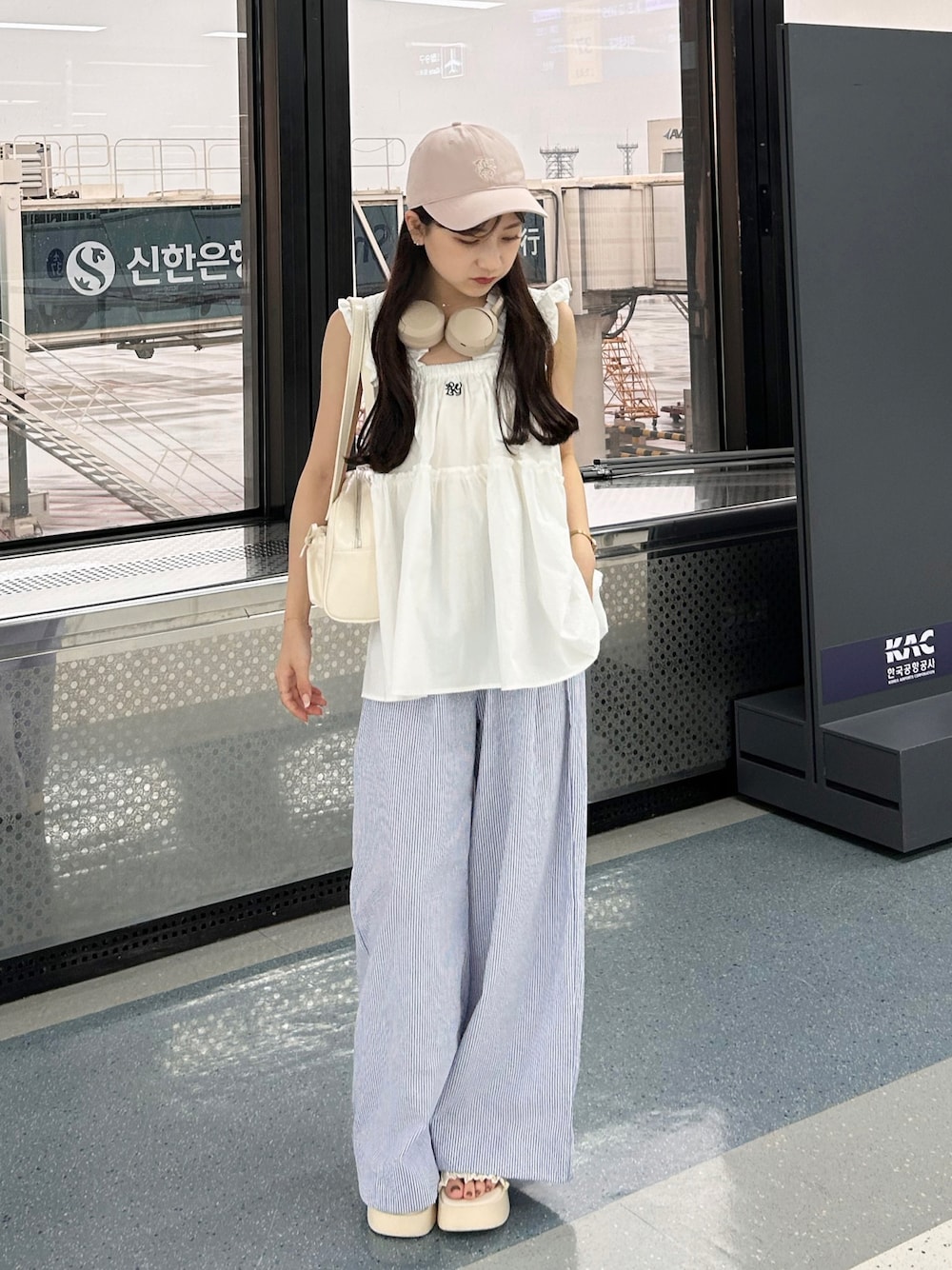 空港コーデ✈️🫶🏻 カジュアルでも可愛くなコーデ💭 ピンクベージュのキャップとヘッドホンが ポイントになって可愛いかも .. ♡ - - - - - - - - - - - - - - - - - - - - - - - ,🏷 instagram : ami___nmo director : umm. claïr YouTube : amimiyu channel 双子でYouTubeやってます💭🩰 よかったら観にきてください 🍑 - - - - - - - - - - - - - - - - - - - - - - -