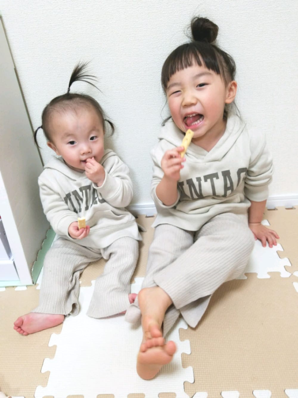 はじめての姉妹お揃いコーデ💗 我ながら か~わ~い~い😂💓 この上下の合わせ方は、 パジャマっぽいっちゃ~パジャマっぽいけど、 自分的には可愛すぎて☺ しかし次女ちゃん80のパンツが大きすぎて おなかのとこ3段曲げて履かせてます😂💦 それでも床に擦る~(笑) ま、可愛いから良しとしよう😁 見ていただきありがとうございます✴
