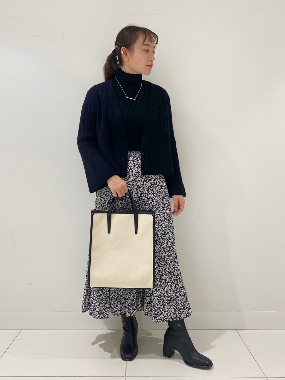オールブラック 以前着たスカート着回しコーデです! ブラックで合わせると、花柄のスカートも雰囲気が変わります♪