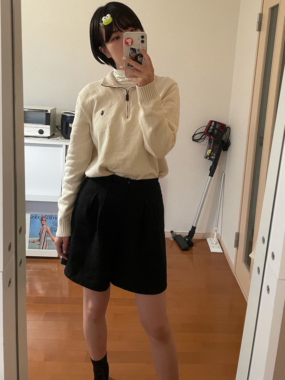 ハーフジップセーターにタートルネックのインナー合わせました。 靴はショートブーツ履いてました。 そろそろショートパンツさむい (ケロッピつけっぱなしだった)