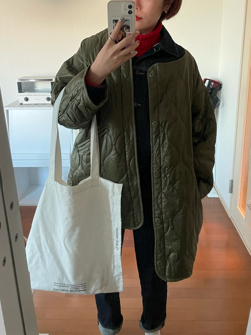 みやのさんのノーカラージャケット「【WEB限定】M65ライナーキルトコート(キルティングジャケット・ノーカラーコート)」を使ったコーディネート