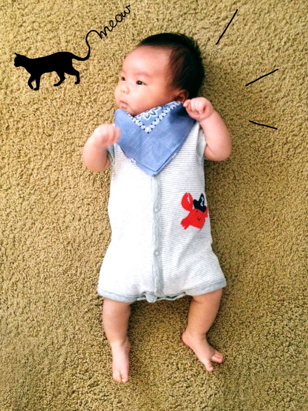 カーターズの前開きロンパースはボーダーとカニさんがキュート なのでよく着せてます。 スタイ代わりにバンダナを切ったやつw 最近暑いので専ら半袖半ズボン。 それでも汗っかき(;´・ω・)