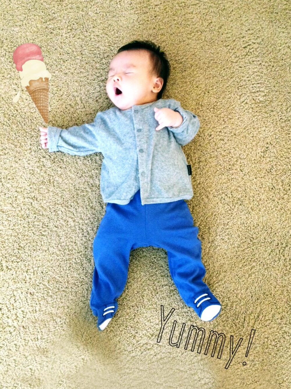 今日はお上品にカーディガンを着せてみました。 パイル地で着心地爽やかです。 パンツは足まですっぽり覆われるタイプ。 スニーカー柄が可愛い♪