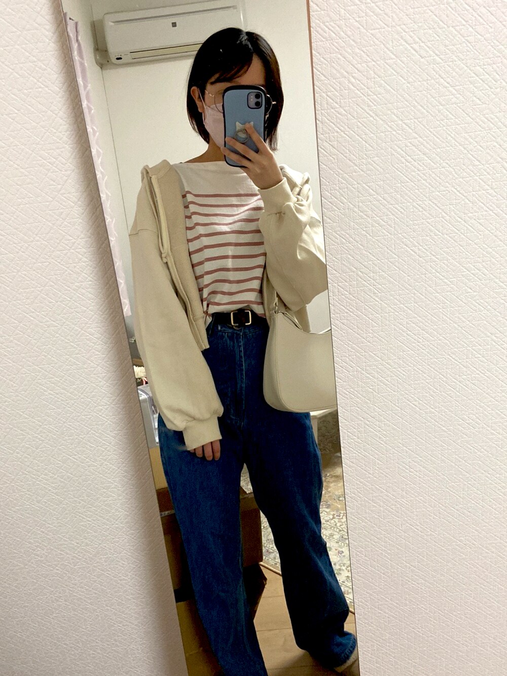 プチプラコーデ このクロップド丈のパーカー可愛すぎる! 春に向けてピンクボーダーも取り入れて、 函館にこの服着ていこうかなあ〜🌸