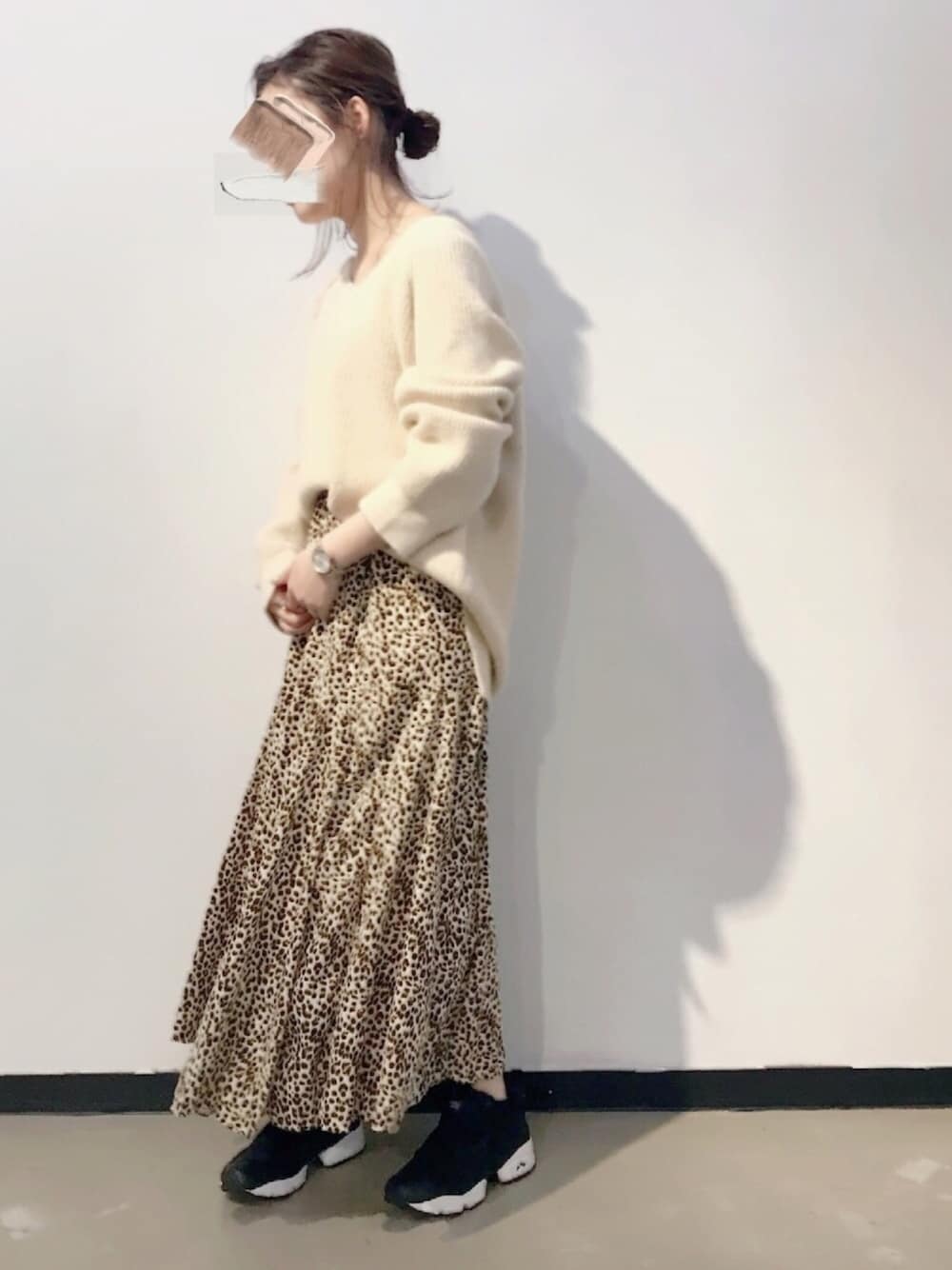 白地のレオパードはトレンドですよねえ、かわいい〜👏🏻👏🏻 だいたいスエットかニットに合わせてます(楽ちん命) 丈長めですが小柄さんでも着れるし落ち感ある形が◎ ニット実はライトグリーンのと色違い🙊💗💗着やすくて色も可愛くて重宝してます!