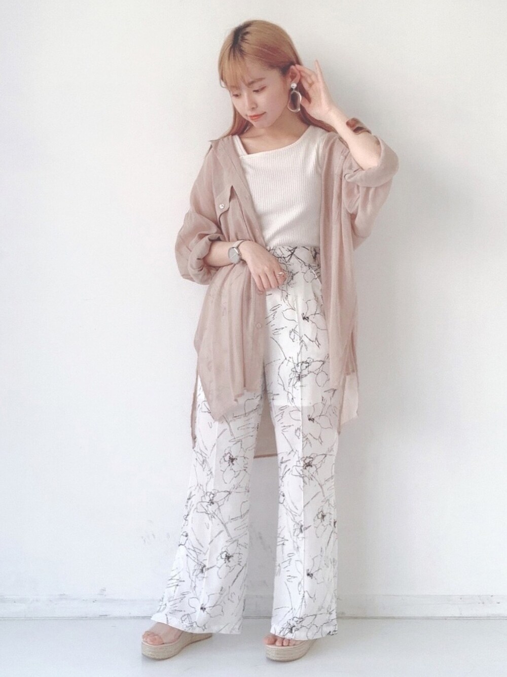 いつも見ていただきありがとうございます⸜🌷︎⸝ ZOZOで人気急上昇中のシアーシャツ👏🏻 ベージュが1番売れてます◎ だよね〜わかる。 使いやすいもん。 と心の中でお客様に共感しております☺︎笑 私は基本的にまとまったワントーンコーデかツートーンコーデが好きなので 今日のコーデはシアーシャツをメインに使った ベージュ×ホワイトコーデです👀 爽やかで明るいカラーが夏らしくていいですよね◎ イヤリング、リング(指輪)、サンダル は全てクリアにしてそこも統一しています︎︎︎︎☑︎ かわい〜〜!! Instagram▷@nono_vu
