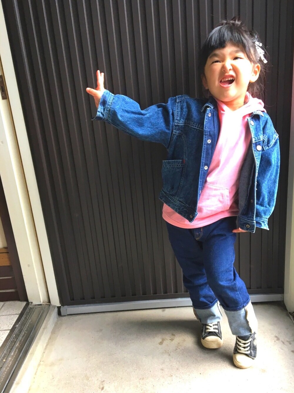 変な顔しかなくて すみませんw デニムオンデニムの中は ピンクのパーカーで女の子要素プラス◉ いま1つでも、女の子要素いれないと怒られます💪