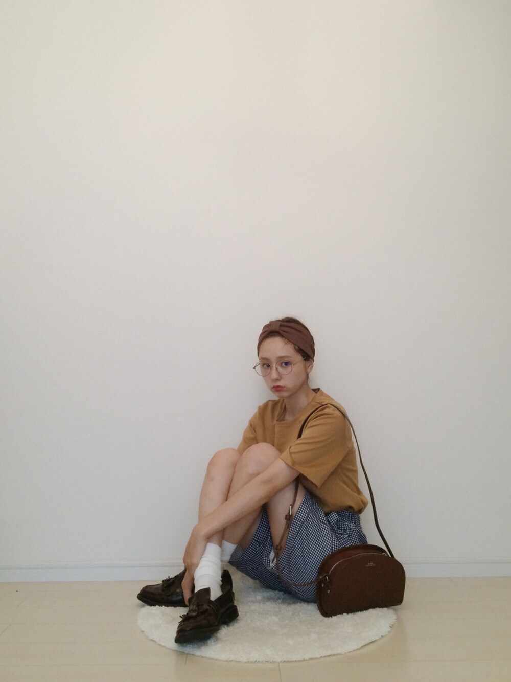 なぜかすわる ...笑 RUBY のギンガムチェックハーフパンツを主役に 他のアイテムはブラウン系でまとめました。🐿 ギンガムチェックって、きちんと感があるのに、どこか少女らしくもあったりして、好きです。