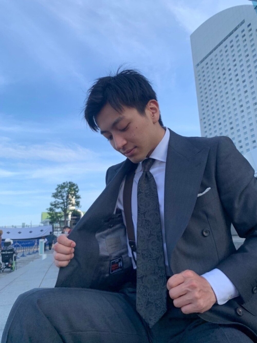 グレー系のフォーマルスーツ/小物を着用したメンズの春コーディネートの1枚目の写真