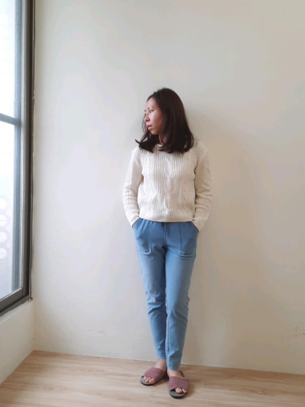 上衣:針織上衣為韓國旅遊購買的,特色是微寬肩、短版。 褲子:口袋造型、高腰綁帶、不用修改😆。