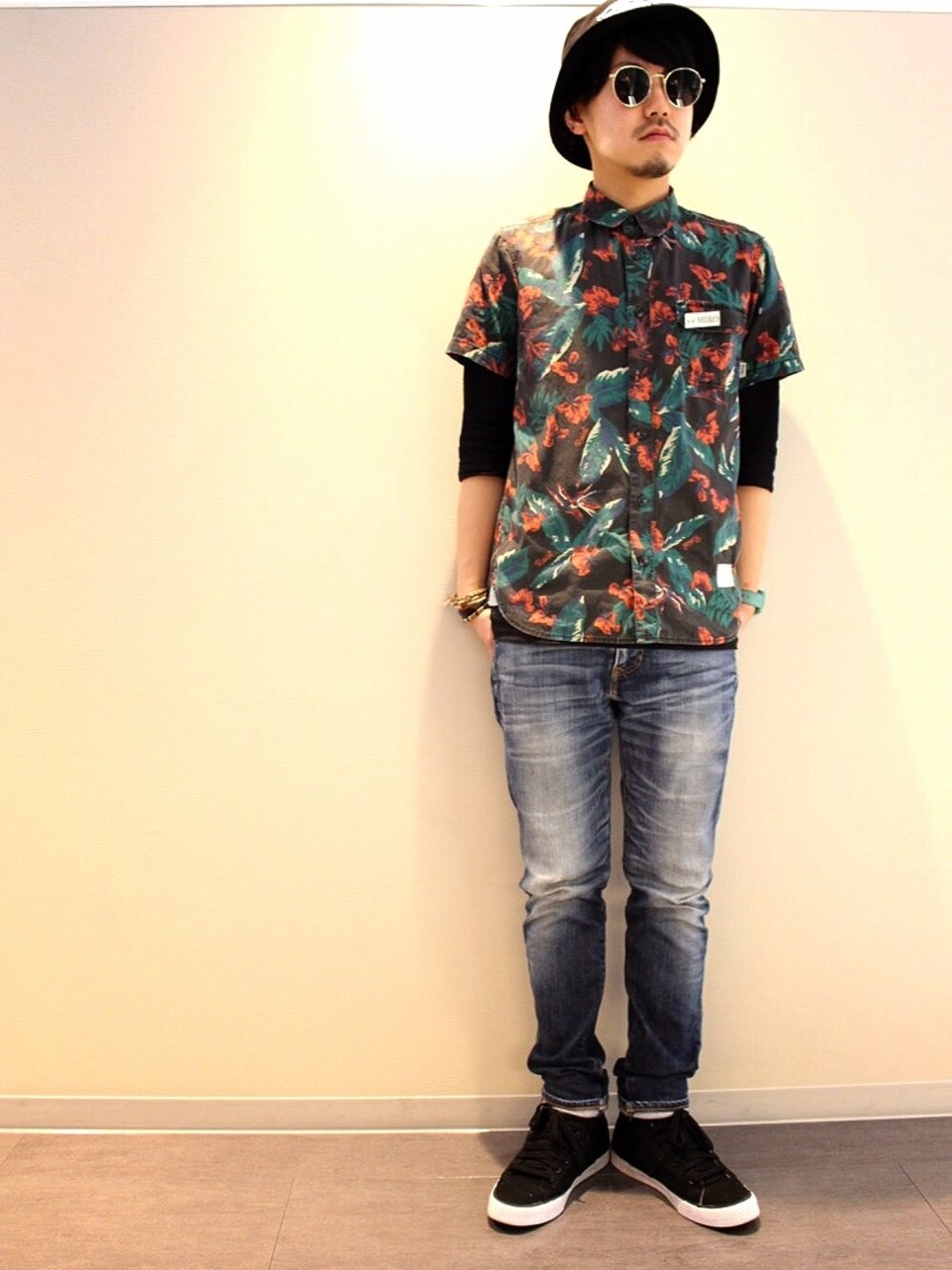チャイニーズマフィア風 笑、 ボタニカルの柄シャツと組み合わせて重ね着してみました(^^)