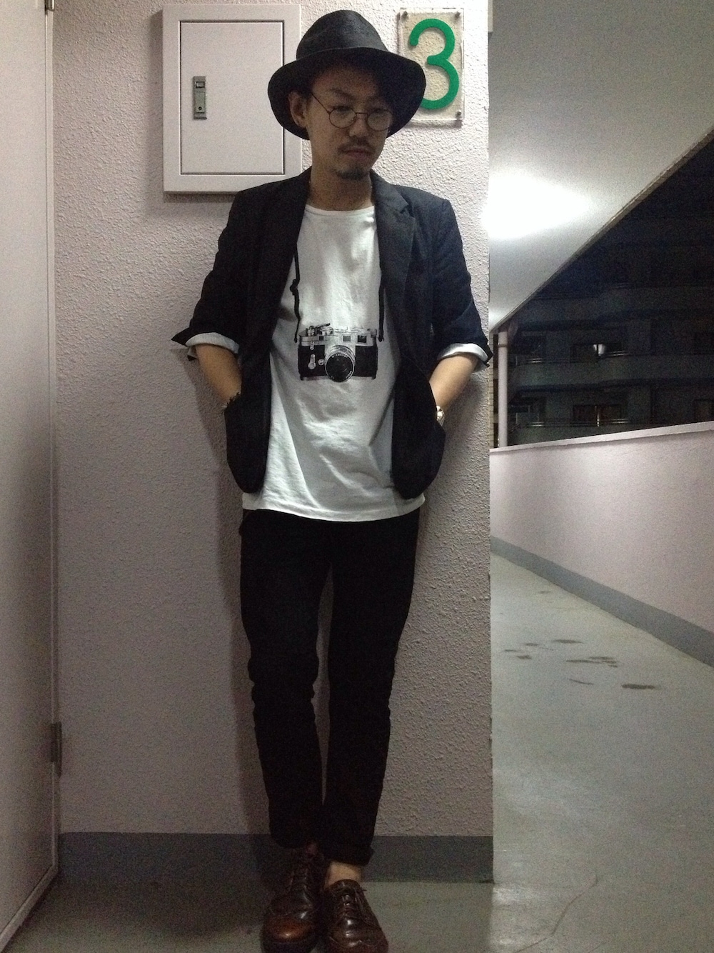 今日は黒X黒でコーデしてみました(^^) 丸めがねとつば広でモードっぽさを出してみました^_^ ジャケットは安定の七分袖‼︎ 袖口の裏地がイイ感じ(^^)