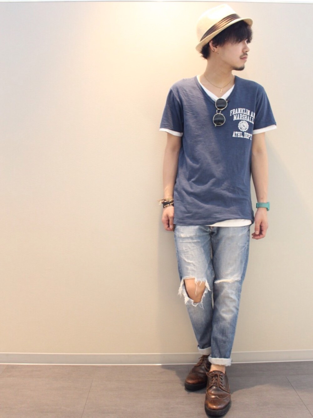 今日はTシャツの重ね着でデニムロールアップしてみました。 今日は暑かったので今年初の麦わらハットを被りました\(^o^)