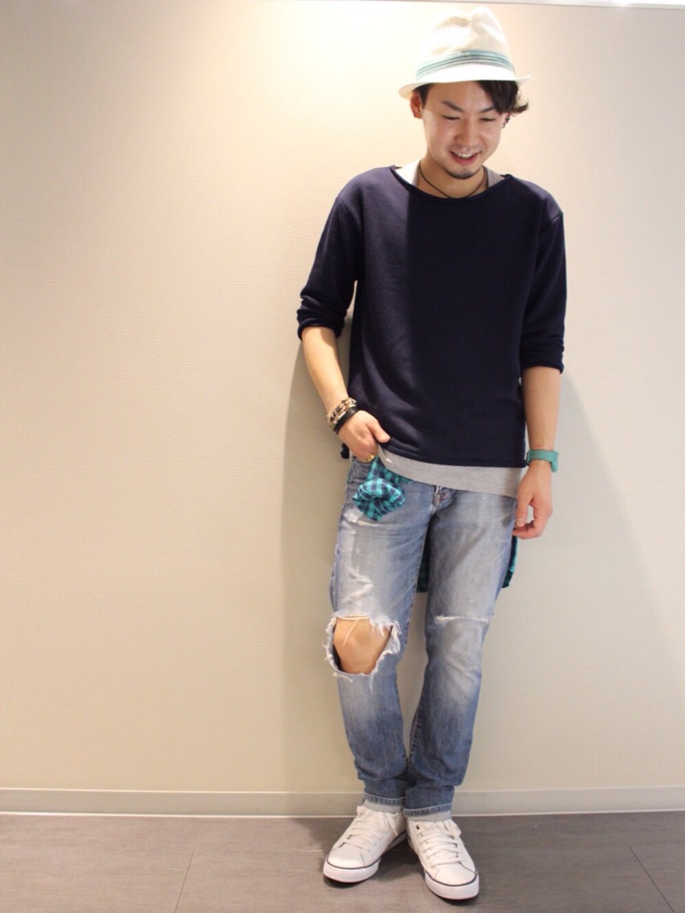 昨日のコーデは、 デニムとネイビーでハットと足元は白でまとめてみました(^^) さりげなくグリーンカラーを所々に入れてみました!