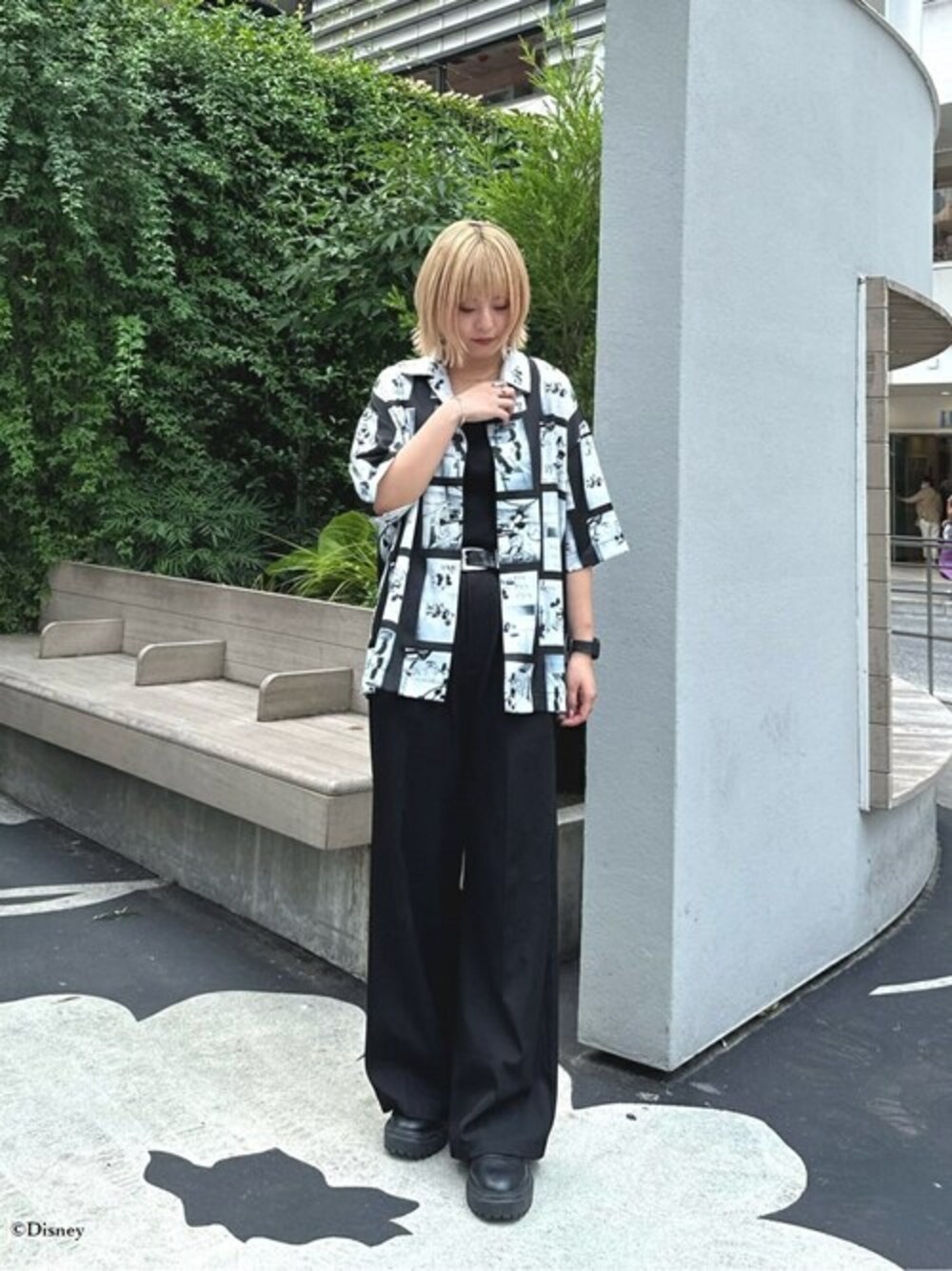 ディズニー・ピクサーカプセルコレクションのシャツを使ったスタイリング。 総柄ではありますが、色がモノトーンなので様々なアイテムやカラーと合わせていただけます! 少し光沢感のある素材で上品な印象に◯