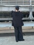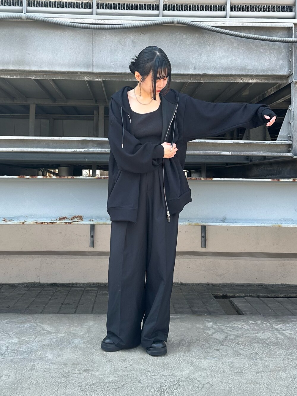 オーバーサイズなジップパーカーを使ったオールブラックコーデ。 とてもなめらかでやわらかい素材感なので、着心地抜群です! 中に着るトップスもさまざまなサイズ感と合わせることができるので着回し面も◎