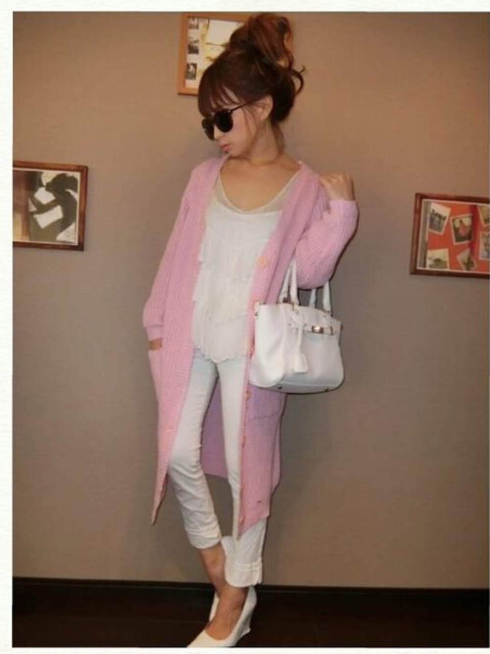 ピンク系のニット/セーターを着用したレディースの春コーディネートの1枚目の写真