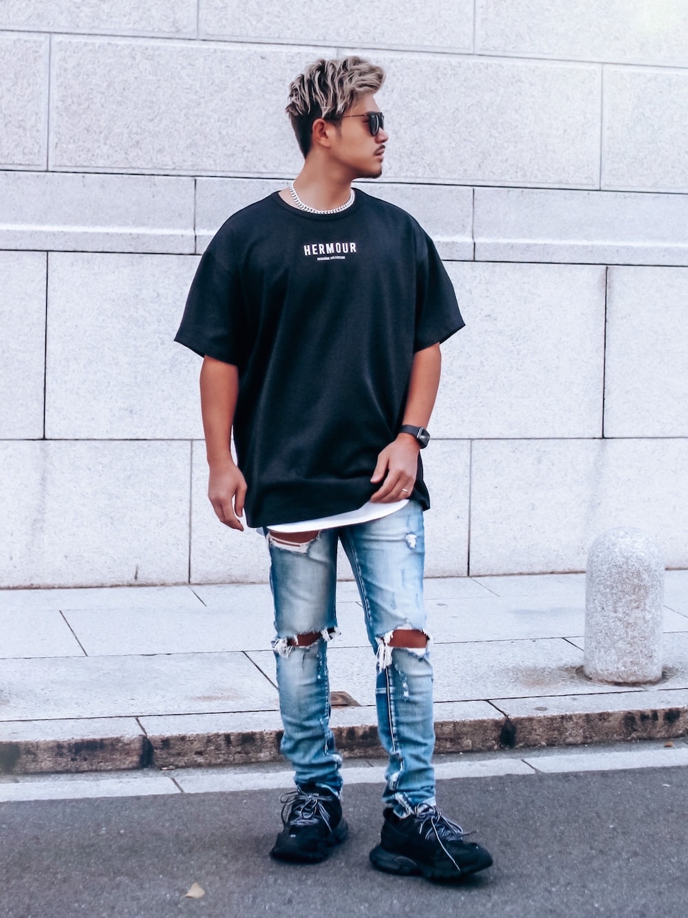 Instagram:aki__0917 も宜しくお願い致します🤝 本日は自社ブランドのHERMOUR(エムール)の新作リフレクターシートを使用したオーバーサイズTシャツを使用したストリートスタイルです。 生地にも最高級な物を使用しております。 世界の綿のわずか10万分の1の超長綿と米超長綿2種類を織り混ぜた生地を採用しました。 ハリ感、ヌメリ感、油分、自然な光沢パーフェクトな1枚となっております。 最高級の2種類の綿が奏でる安心する様な肌に馴染む着心地は1度袖を通すと虜になります。 リフレクティブシートを使用し、綺麗な表面に仕上げ、美しい発光を演出しました。 自社では生地を無限に取り扱い生産までも独自で管理しております。 Instagramにてコーディネート等も載せてますので是非フォローの方宜しくお願い致します😊🤝