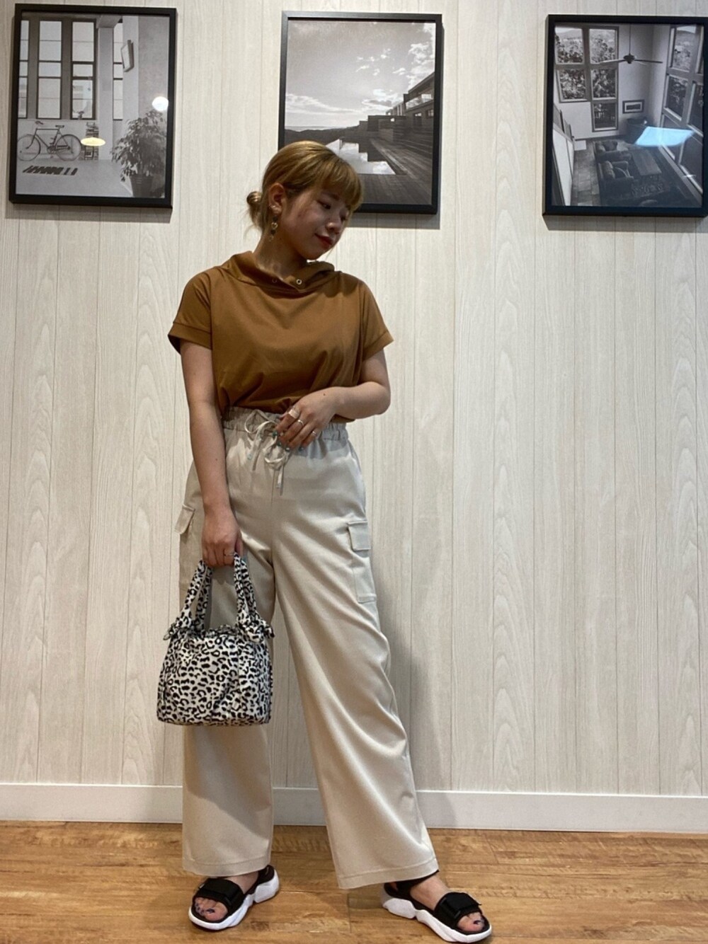 こんにちは、mです😊 本日はオススメコーデです💁♀️ トップスは抜け襟になってて、シンプルながらも可愛い1枚🥰👍 レーヨンのカーゴパンツでカジュアルコーデ😉✨ 小物にレオパードで存在感あるコーデに💭 見て下さりありがとうございます😊 いいねとフォローお願いします😊