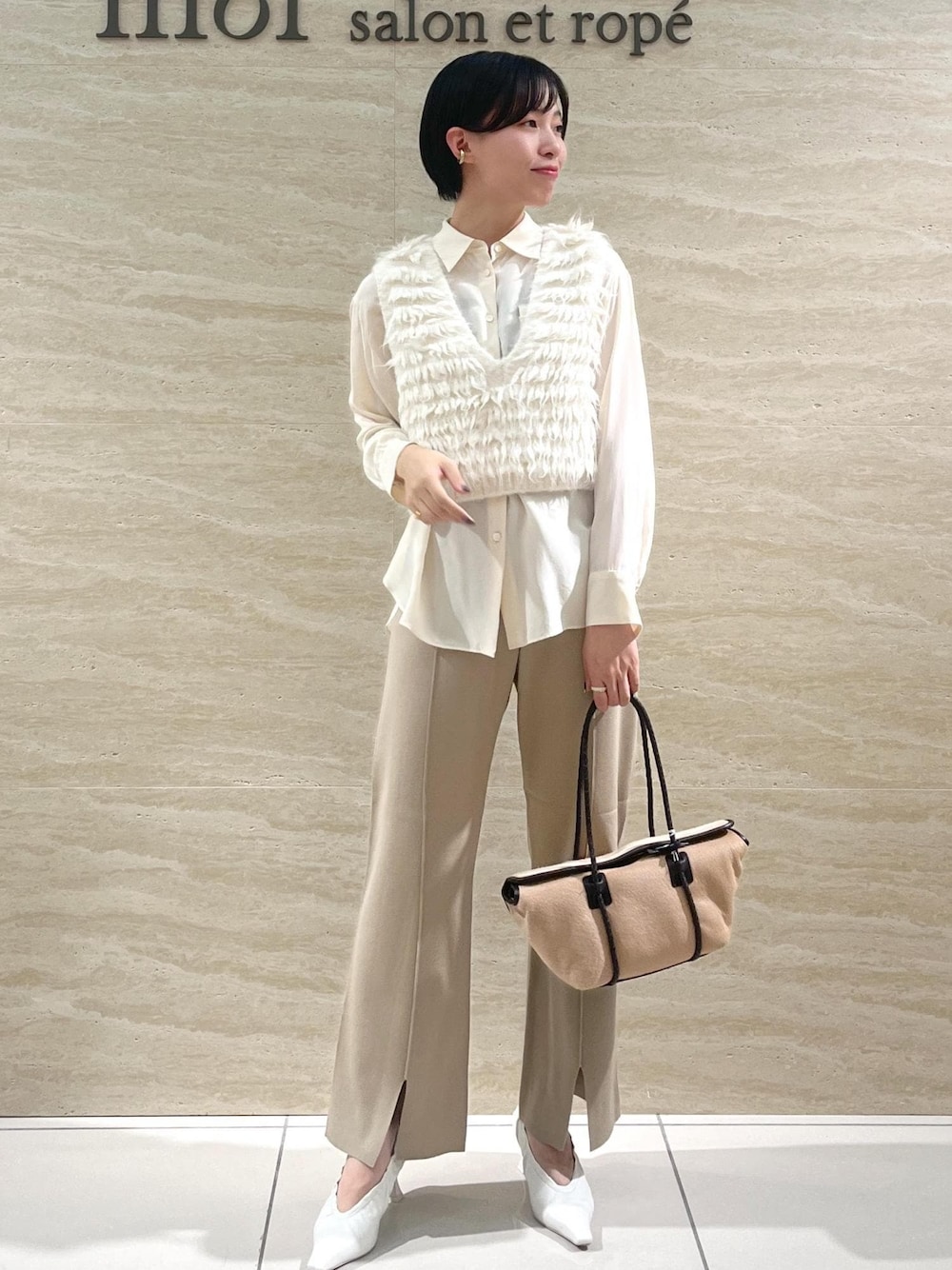 ご覧いただきありがとうございます♪ 段々と毛足感のあるアイテムを身につけたくなる、秋の素材感MIXコーデを組んでみました! ふわふわの毛足感が印象的なニットベストには、ツルッとしたサテンシャツやシアーインナーとの組み合わせがお勧めです! 今回は同系色のクリームカラーで素材の違いを分かりやすくコーディネートしてみました♪ item bag : お問い合わせ番号MEX34160 ¥92,000+tax