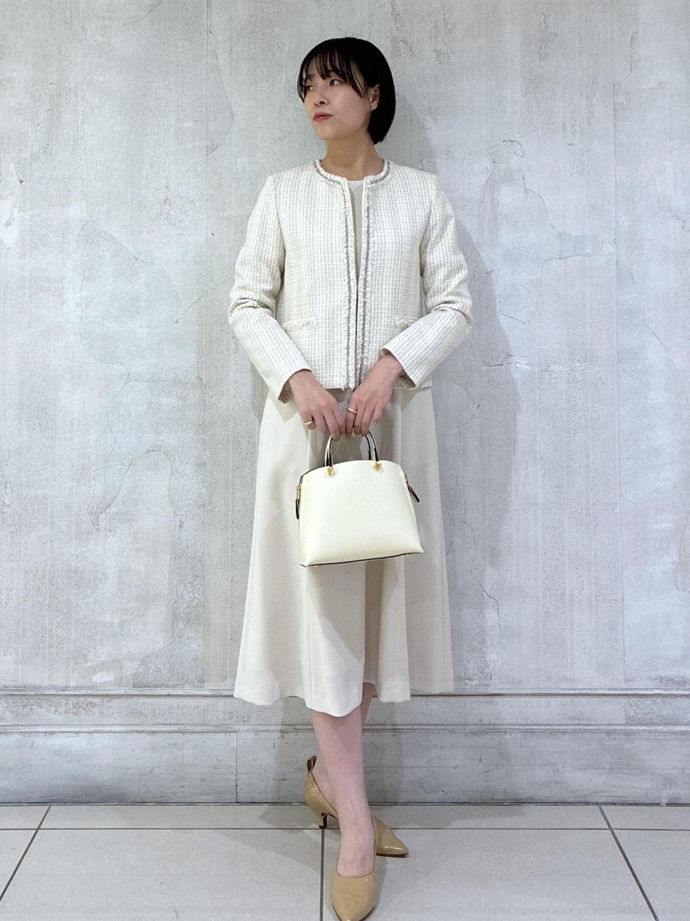 ご覧いただきありがとうございます♪ 王道なツイード×ワンピースのセレモニーStyle 年が明けて、徐々に卒入式のアイテム下見を始められる方が増えてまいりましたので、newデザインにアップデートしたワンピースを主役にセレモニースタイルを組んでみました。 今季フレアデザインにアップデートしたノーカラーワンピースは、膝下丈で座った時のフレア感がエレガントな逸品です! 同色のジャケット合わせでの組み合わせが、カラーバランスも整いハレの日の祝福をコーディネートで表現できます♪ ◾︎パンプス(L'unique et moi) ※ moi salon et rope"の店舗でのお取り扱いとなります。 詳細については、店舗へ直接お問い合わせください。 .