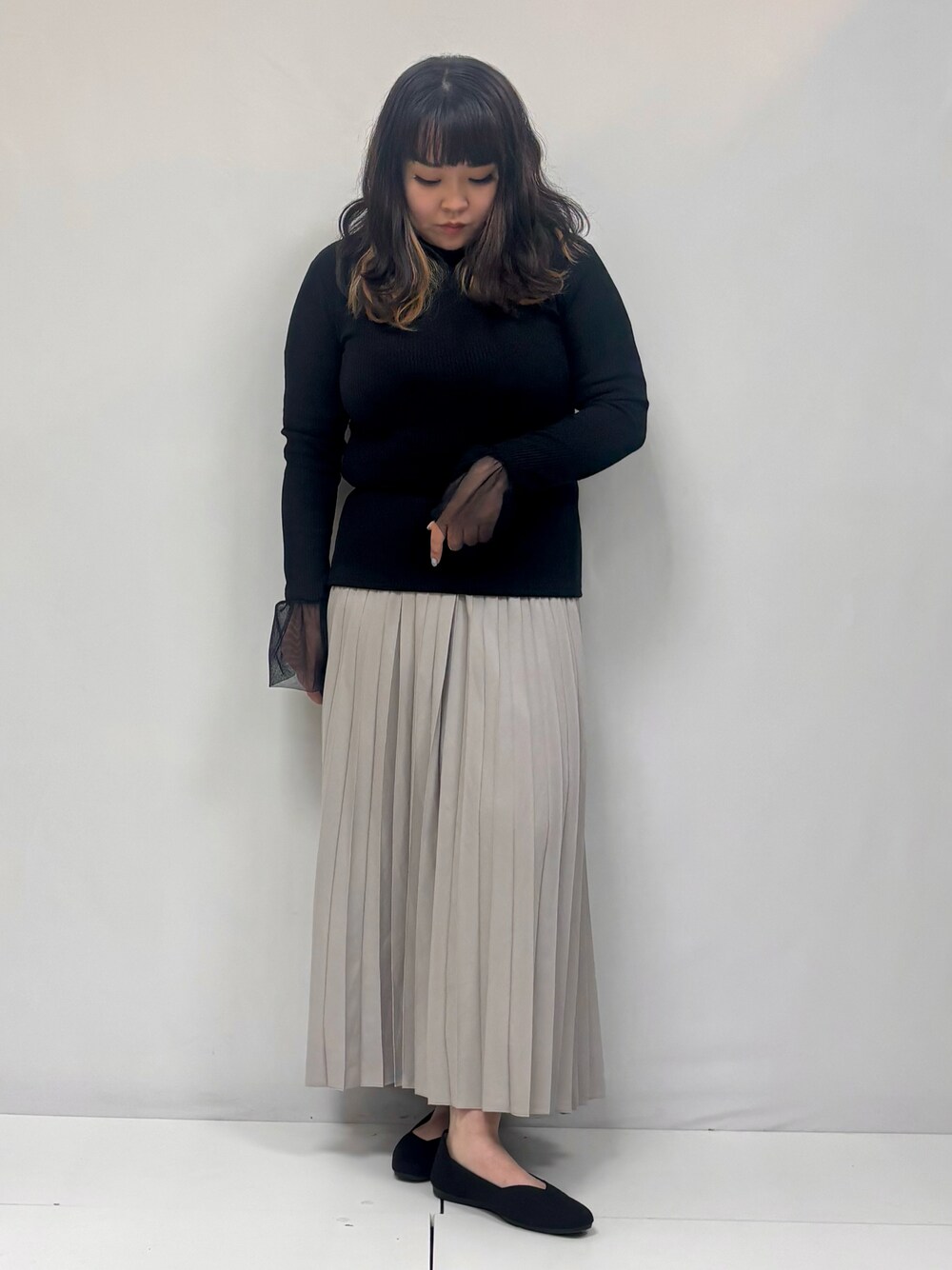ぁむ(SHOO・LA・RUE)のスカート「◆微光沢で華やか レザー調プリーツスカート」を使ったコーディネート