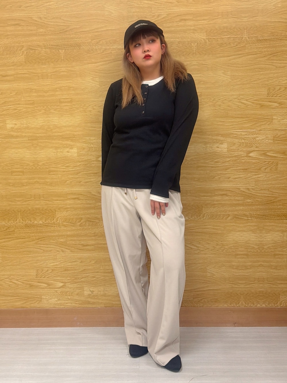 ぁむ(SHOO・LA・RUE)のTシャツ/カットソー「【洗濯機可/S-LL】1枚でサマ見え レイヤード風配色 ヘンリーネックロンT」を使ったコーディネート